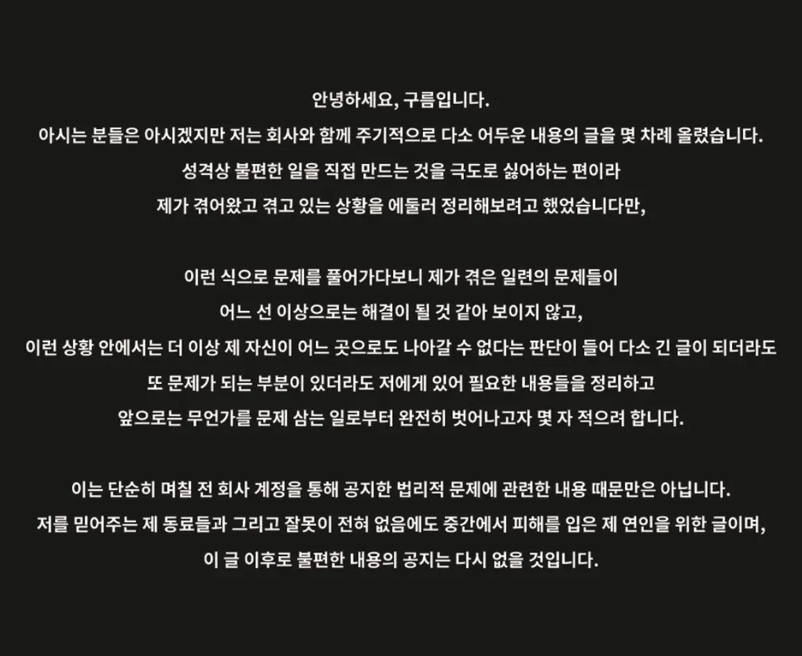 구름은 14일 자신의 인스타그램에 장문의 글을 통해 PLP와 소속 아티스트로부터 자신과 현재 연인이 겪은 일련의 피해 사실을 폭로했습니다.