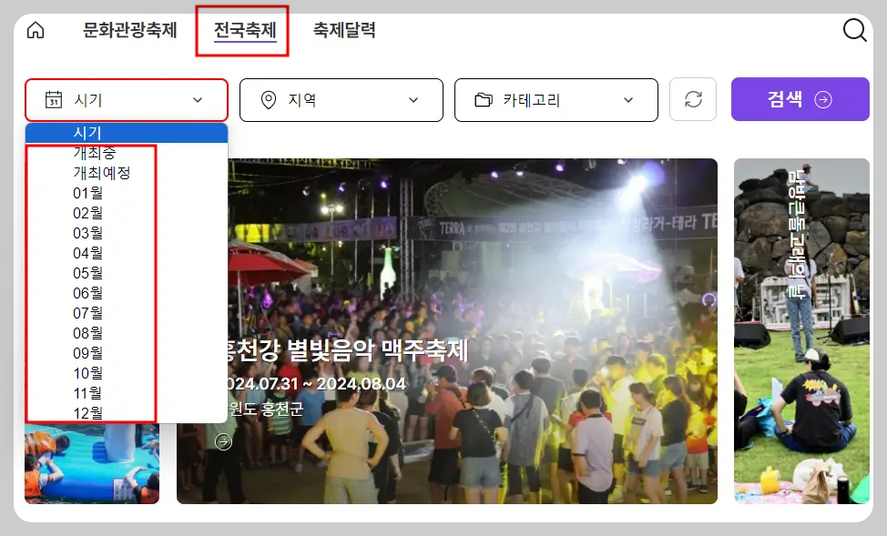 전국축제를 선택하시고 아래 시기를 누르시면 현재 개최 중인 축제와 개최예정인 축제, 월별로 행사하는 축제를 선택할 수 있습니다. 내 휴가 기간이나 일정에 맞춰서 선택하세요.
